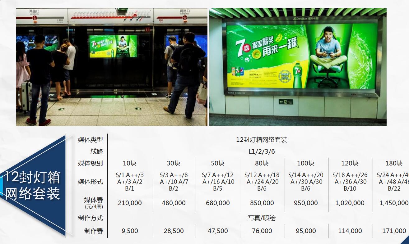 媒體類型: ?重慶地鐵梯牌套裝 套裝1:L1 ? ? ? ? ?媒體分布:全線覆蓋套裝 媒體費用:460,000 套裝2:L3 ? ? ? ? ? 媒體分布:全線覆蓋套裝 媒體費:540,000 套裝3:L6 ? ? ? ? ? 媒體分布:全線覆蓋套裝 媒體費:400,000 制作費:40元/塊 |