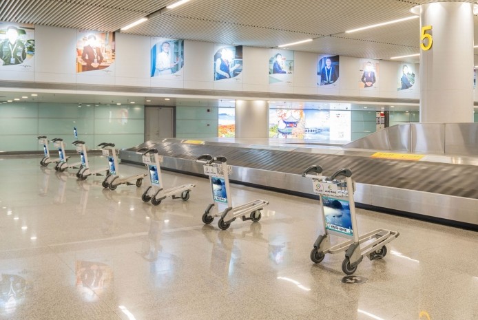 媒體位于 T1 航站樓到達層行李廳外排,燈箱自帶高光。周邊環 境寬闊、明亮,媒體環境干凈干擾少,畫面視覺沖擊力強。