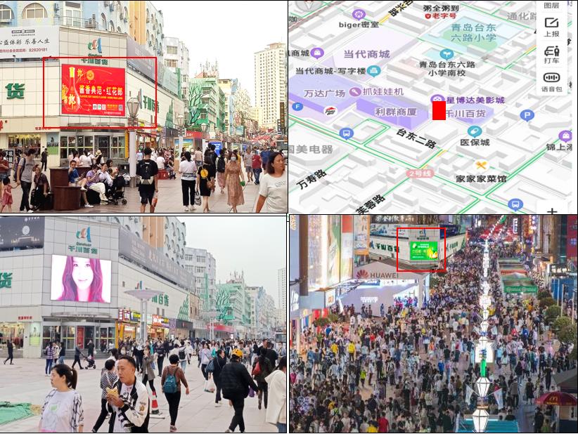 1、屏幕位于臺東三路步行街的中心位置,對面利群商廈,緊鄰萬達廣場,人流量巨大,屏幕所處位置十分明顯,位于十字路口方向。