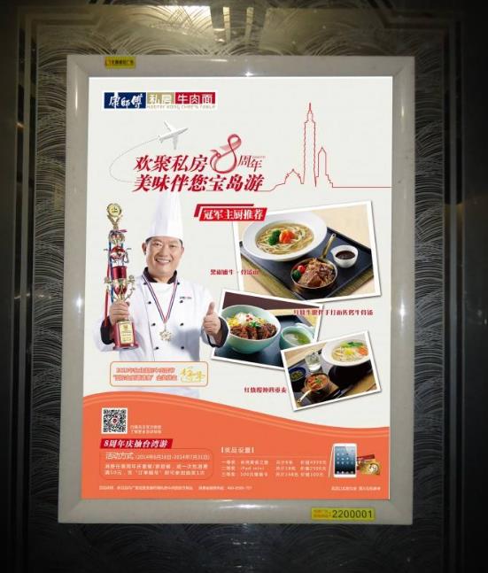 成都電梯框架廣告由廣告框和廣告畫面組成,根據(jù)投放周期和投放數(shù)量的不同,價格會有不同優(yōu)惠。