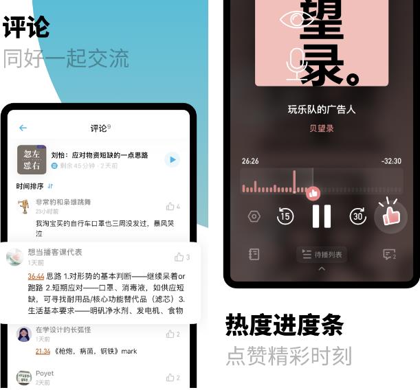 界面特別清新,比其它APP界面簡潔,可以根據聽到哪一段進行評論,評論區有很多令人感同身受的觀點。 —— 南城以南溫暖如初 統計收聽時長這個功能最滿意。
